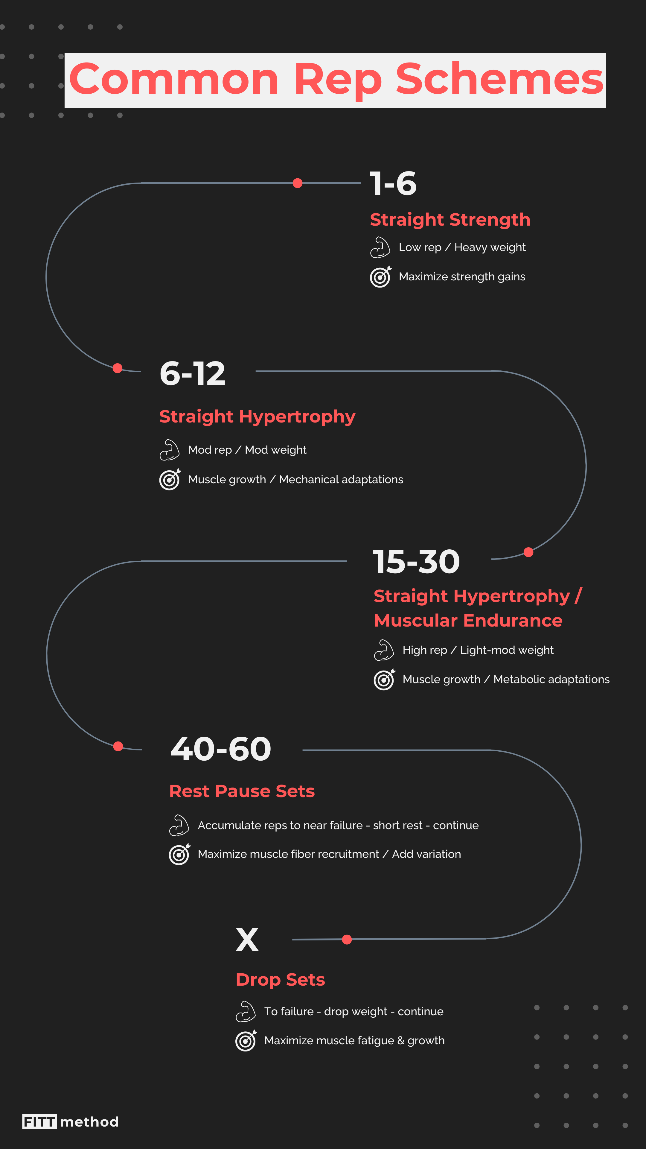 Different rep schemes can be used to achieve various fitness goals with the back squat. Here are some common rep schemes to consider.